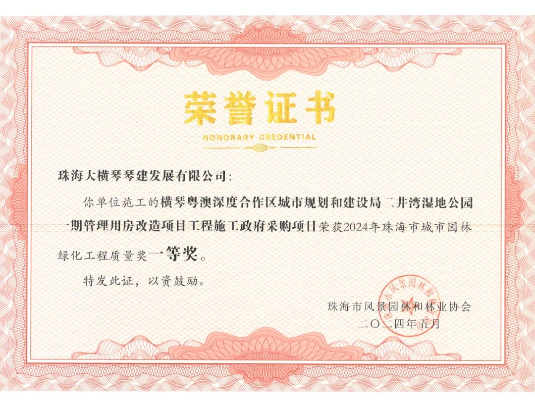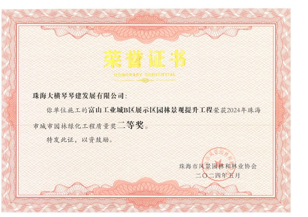 橫琴粵澳深度合作區(qū)城市規(guī)劃和建設(shè)局市政管理署2023年專類公園綜合管養(yǎng)政府采購項(xiàng)目、橫琴粵澳深度合作區(qū)城市規(guī)劃和建設(shè)局二井灣濕地公園一期管理用房改造項(xiàng)目工程施工政府采購項(xiàng)目,榮獲2024年珠海市城市園林綠化工程質(zhì)量獎(jiǎng)一等獎(jiǎng)!富山工業(yè)城B區(qū)展示區(qū)園林景觀提升工程,榮獲2024年珠海市城市園林綠化工程質(zhì)量獎(jiǎng)二等獎(jiǎng)!