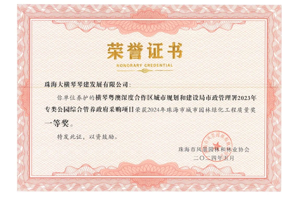 珠海市城市園林綠化工程質(zhì)量獎(jiǎng)是本市園林綠化工程類的重要獎(jiǎng)項(xiàng),旨在提高景觀園林綠化建設(shè)的質(zhì)量和水平,評選出在全市具有引導(dǎo)和示范作用的景觀園林綠化優(yōu)秀工程及養(yǎng)護(hù)項(xiàng)目。本次獲獎(jiǎng),是珠海市風(fēng)景園林和林業(yè)協(xié)會(huì)對大橫琴集團(tuán)管養(yǎng)項(xiàng)目、施工項(xiàng)目與代建項(xiàng)目品質(zhì)的認(rèn)可與鼓勵(lì)。同時(shí)也是大橫琴集團(tuán)在貫徹落實(shí)市委、市政府關(guān)于“綠美珠海生態(tài)建設(shè)”工作部署中取得的階段性成效。